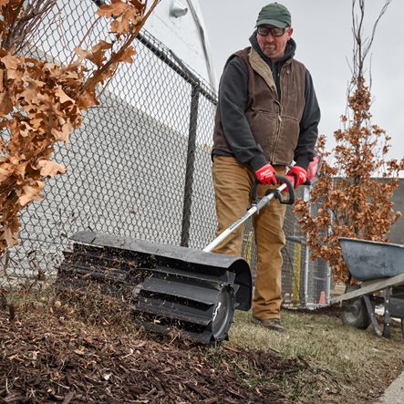 - Szczotka gumowa do zamiatania kamieni, liści, brudu, ściółki i innych zanieczyszczeń z obszarów trawiastych i innych twardych powierzchni, takich jak chodniki, ścieżki, podjazdy