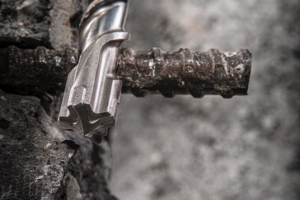 - Duże ostrze z węglika z opatentowanymi skosami krawędzi. Zapewnia niższe wibracje i zoptymalizowaną wydajność wiercenia przy napotkaniu stali zbrojeniowej, co oznacza dłuższą żywotność.